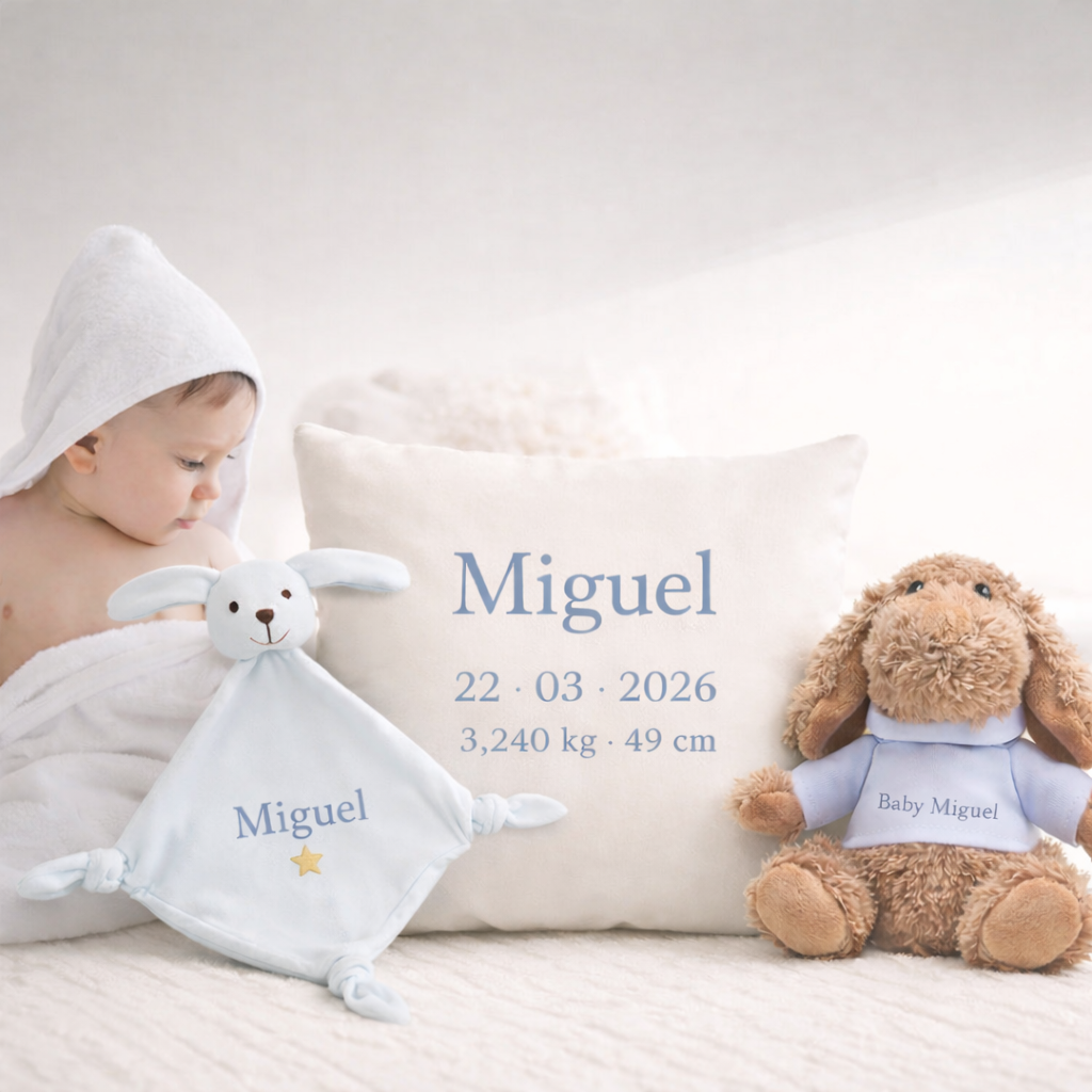 Um conjunto completo e elegante, personalizado para celebrar e eternizar o nascimento do bebé com um toque especial.